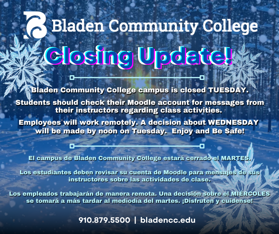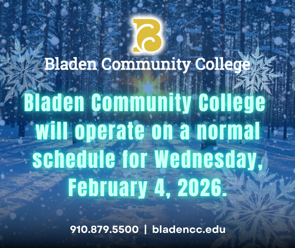 Bladen Community College will operate on a normal schedule for Wednesday, February 4, 2026. ... See MoreSee Less