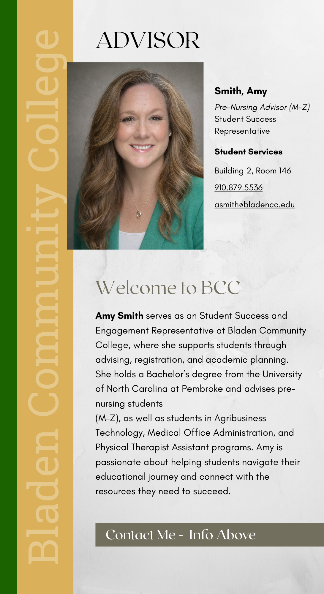 Welcome to the Center for Student Success and Engagement at Bladen Community College located in Building II, Room 141A. Academic advising is an integral part of BCC’s commitment to the process of educating our students. Our team of Student Success and Engagement Representatives (advisors) are here to guide you along your academic journey at Bladen Community College! You’ll work one-on-one with an advisor who will make sure you have the resources and information to complete your program and move confidently toward your next step —whether starting your career or transferring to a university. Student Success and Engagement Representatives (advisors) offer “in-person” and/or virtual advisement sessions.