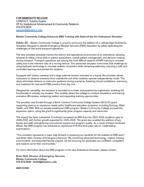 Bladen Community College Enhances EMS Training with State-of-the-Art Ambulance Simulator