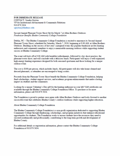 Dublin, NC — December 5, 2025 — Bladen Community College is honored and humbled to announce the largest philanthropic gift in our history, a transformative contribution that will shape the future of our college and the community we serve for generations to come.